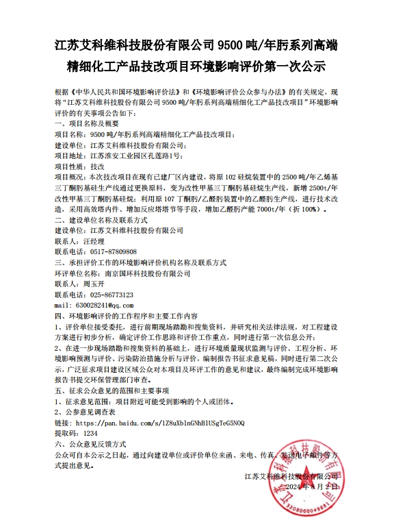 江蘇艾科維科技股份有限公司9500噸/年肟系列高端精細化工產品技改項目環境影響評價第一次公示